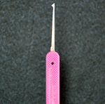 This pick is manufactured from 0.018 thick Government Steel and then molded into a purple toned plastic handle. This is our second thinnest series of picks. While they are somewhat thicker than the 0.015 picks, they are designed with the "Euro" shank reduction to enhance egress into restrictive key ways. They are designed to be useful for locks having narrow key ways and to provide some more strength than the 0.015 picks.