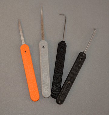 What makes Peterson world famous? One reason is the top quality tools we continue to develop for security professionals around the globe. Wherever you find locks, you find Peterson tools doing exactly what their names describe. Our DAMES Series bypass tools are no exception. They defeat many locking system's Defenses Against Methods of Entry. That's how we made them, and that's why professionals the world over depend on them. Sold together as a kit to save you money, the 4P-BPS is our first package of bypass tools we released, and it is still a great selling product because it saves you time and effort. Whether you are a large operation or a one person show, Time is Money! Our DAMES set will help make and save you both. Match it with a Peterson pick set for an unbeatable combination. 4 piece bypass kit: 1 knife, 1 mini-knife, 1 AR trip wire & 1 AD-B Padlock Tool.